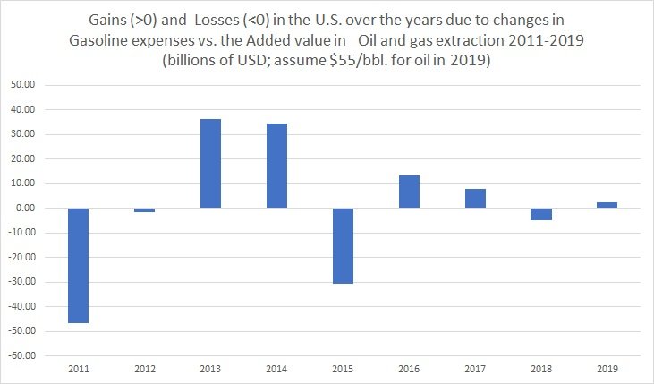 Conversely, the estimated gasoline expenses in the U.S. were $316 billion in 2018. Assuming the elasticity is 0.92 (again, based on simple regression analysis), the results yield savings of roughly $30 billion to consumers and companies. So, the summing up the two figures from the two calculations results in a very modest net gain of roughly $3 billion to the economy (in the form of savings to households).