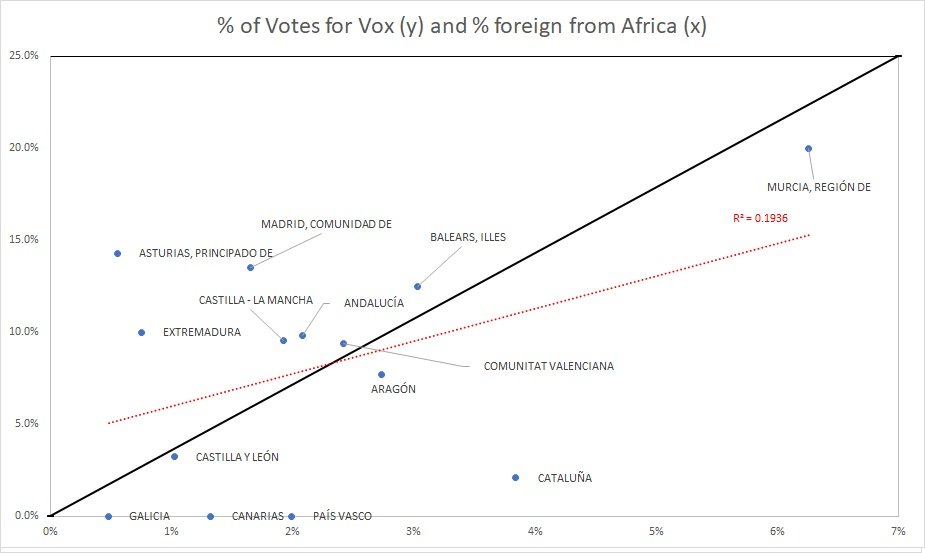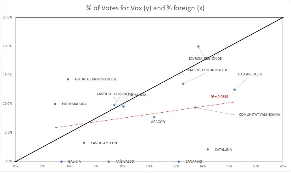 Even when I consider the proportion of foreigners in each community, this break down also doesn’t appear to explain the popularity of Vox in specific autonomous communities.