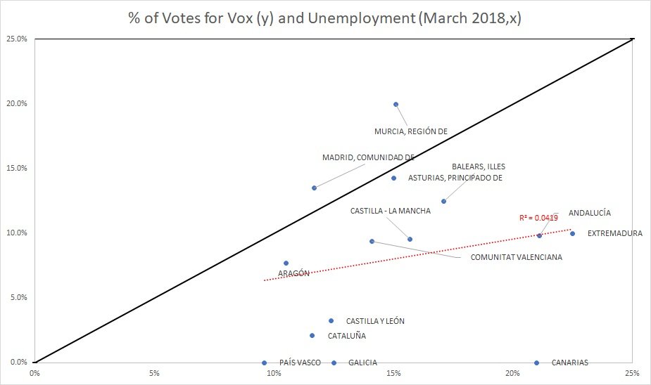 As one can see the unemployment rate in the various autonomous communities[1] doesn’t seem correlated with the percent of Vox seats gained in each community.