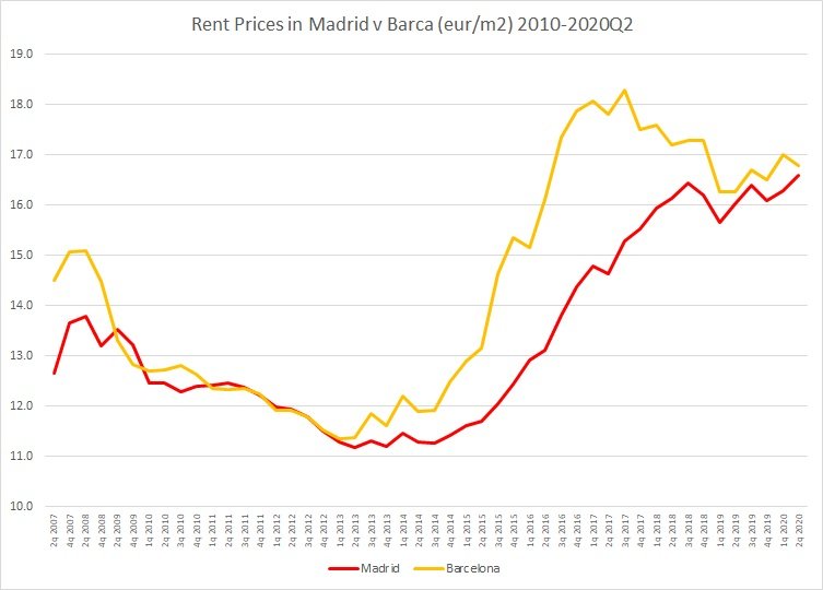 One answer could be the stability of rent prices: Over the past few quarters, rent prices (based on data from Idealista) have climbed. As of Q2 2020, in Barcelona, the average rent rose to 17.6 euro/meter or 8.2% YoY, whereas in Madrid, it reached 16.6 euro/meter or 3.5% YoY.