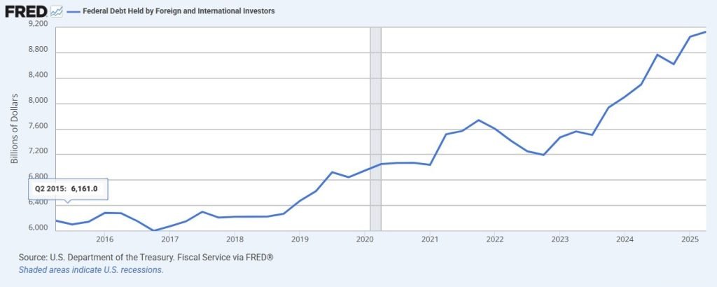 On the other hand, the weaker US dollar against many currencies has contributed to the decline in value of treasuries in central banks’ holdings. But this trend doesn’t suggest a lack of demand. Indeed, as the chart below shows, the foreign holdings of treasuries have been climbing at a steady pace, including in the last few years. While some countries may have scaled down their holdings, such as China, others, including the UK, raised their stakes in treasuries.